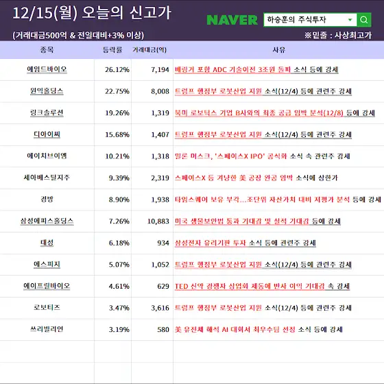 12월15일(월) 특징테마, 특징주 입니다. 더 많은 주식 자료는 '하승훈의 주식투자' 네이버 카페에서 무료로 보실 수 있습니다.😊
