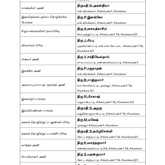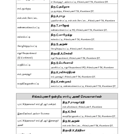 சிவகங்கை மாவட்டம், திருப்பத்தூர் தெற்கு ஒன்றிய கழகச் செயலாளர், மாவட்ட புரட்சித்தலைவர் எம்ஜிஆர் மன்ற இணைச் செயலாளர், சிங்கம்புணரி மத்திய ஒன்றிய கழக நிர்வாகிகள், சிங்கம்புணரி ஒன்றிய ஊராட்சி கழக செயலாளர்கள் மற்றும் சார்பு அணி செயலாளர்கள் அனைவருக்கும் எனது நெஞ்சார்ந்த நல்வாழ்த்துக்கள்.