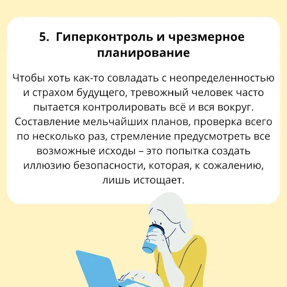 Узнали что-то из этого? Важно помнить, что тревожность – это не слабость, а состояние, с которым можно и нужно работать. Если эти привычки мешают вам жить полноценно, не стесняйтесь обратиться за помощью к специалисту. Вы не одиноки, и есть способы сделать свою жизнь легче! ❤️