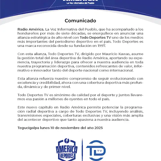 🚀 ¡Anunciamos nuestra alianza estratégica con Todo Deportes TV! 🏆 Juntos, traeremos contenido deportivo innovador y de calidad bajo el liderazgo de Mauricio Kawas. ¡Estamos emocionados por esta nueva era en el periodismo deportivo! #RadioAmérica#TodoDeportesTV#DeportesInnovadores 📺⚽