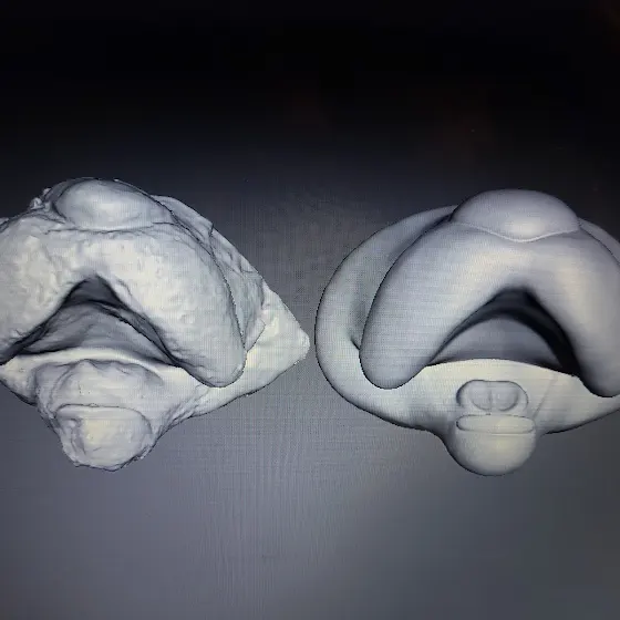 I've been experimenting with 3D scanning to digitally repair and recreate the existing masks for my animatronics. Here's Colonel Beauregard's latex mask glued back together, reinforced, 3D scanned and digitally cleaned up. Left in the first image is the raw scan of the 40 year old mask, right is after digitally undoing the damage. I turned the sculpt into a mold (not shown) in Meshmixer and I'll 3D print it to cast a new mask for him. The scan is dimensionally accurate so the old fur should fit right onto the new mask.