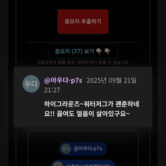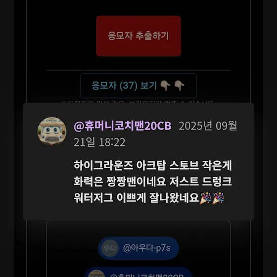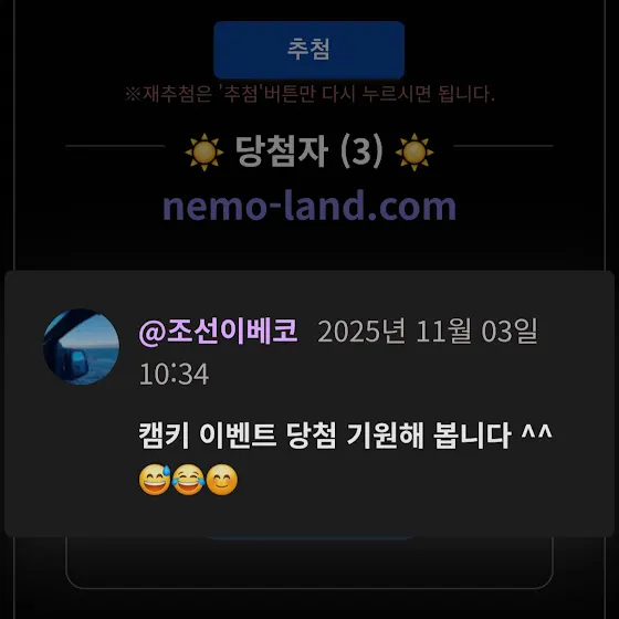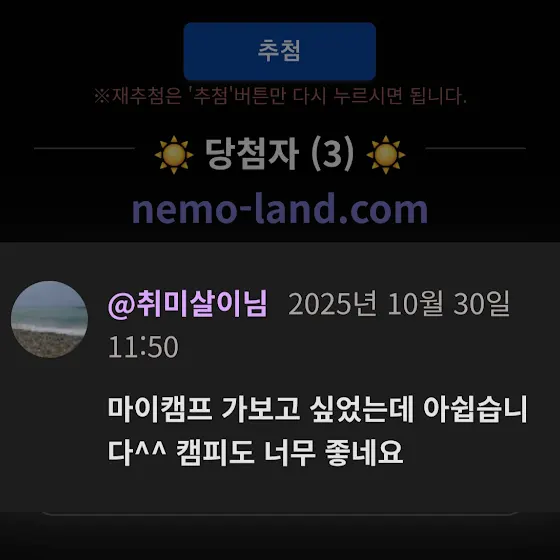 당첨되신분은 캠핑헌터 구독자 화면캡처