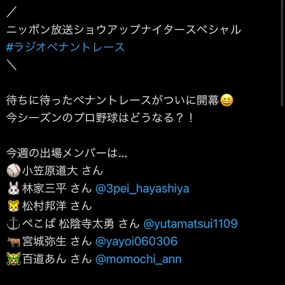 ショウアップナイタースペシャル ラジオペナントレース ニッポン放送 2025/1/25(土) 17:50-19:00 radiko.jp/share/?t=20250125175000&sid=LFR #radiko #シェアラジコ #ラジオペナントレース