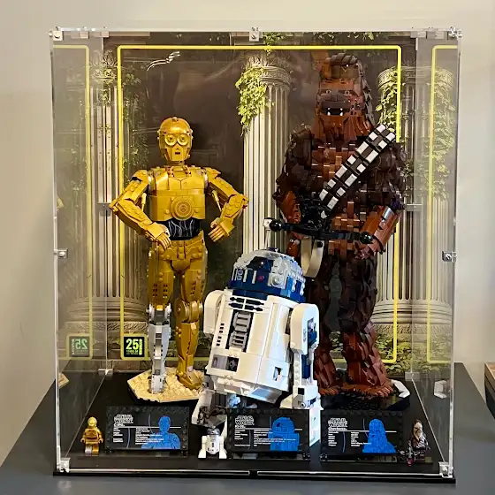 This display case includes space for three LEGO Star Wars buildable characters, C-3PO, R2-D2 and Chewbacca! The printed background is the Yavin IV ceremony hall and the quality is fantastic.