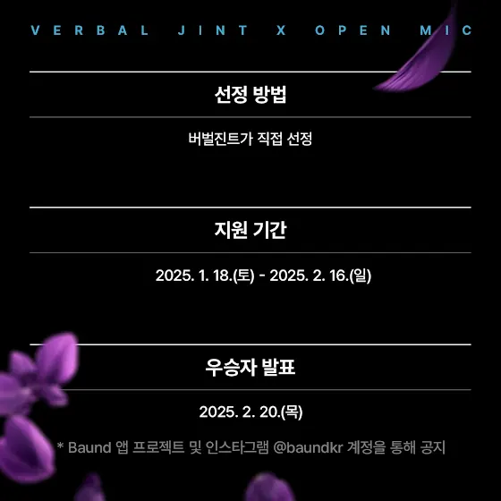 이번 Baund Open Mic에 우승자로 선정된 바운드 플레이어는 2024년 2월 16일 홍대 플렉스라운지에서 열리는 'RAP HOUSE VOL.27'에 출연하여 본인의 무대를 선보이게 됩니다.
