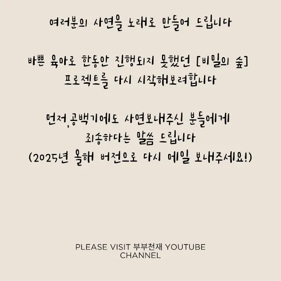 여러분의 사연을 노래로 만들어드립니다 [비밀의 숲]“비밀의 숲”은 여러분의 사연으로 곡을 만드는 프로젝트예요.누구나 마음속에 하나쯤은누군가에게 털어놓고 싶은 비밀이 있잖아요.조금은 부끄럽고, 조금은 아련한 이야기들.그런 이야기들을 모아서,노래로 만들어드리려 합니다.말 못 했던 감정, 기억에 남는 순간,잊지 못할 사람… 어떤 이야기든 괜찮아요.사연을 보내주시면,그 중 한 편을 골라저희가 직접 곡을 만들고 노래해서세상에 단 하나뿐인 음악으로 들려드릴게요.참여 방법이 메일에 답장으로당신만의 이야기를 적어 보내주세요.익명도 물론 가능해요!여러분의 다양한 이야기 기다리겠습니다.어떤 사연도 좋습니다.gahwaman@naver.com 으로 언제든지 보내주세요!