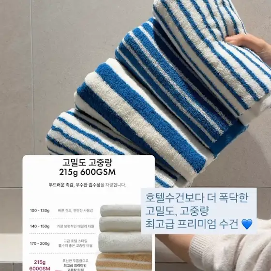 ✓ 𝟭𝟬𝟬% 코마사원단 : 잔사가 제거된 코마사는 원사길이가 길어 촉감이 부드럽고 흡수성이 뛰어남 ✓ 선염방식 : 색상이 쉽게 바래지 않고 물빠짐/이염이 적음 ⤷ 후염방식에 비해 훨씬 비싼 공정, 높은 내구성, 더 부드러운 촉감 ✓ 선염타올은 화학적 처리를 덜해 피부자극 최소화 ✓ 215g 600GSM : 최고급 프리미엄 고중량 타월 ✓ 오코텍스 CLASS 1 인증 - 3세 미만의 아가들도 안심하고 사용하는 등급 ✓ 형광증백제 불검출 테스트 완료 ✓ 이염테스트 완료