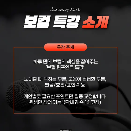 ✅특강 주제 하루 만에 보컬의 핵심을 잡아주는 '보컬 원포인트 특강’ 노래할 때 막히는 부분, 고음이 답답한 부분, 발음/호흡/표현력 등 개인별로 필요한 포인트만 집중 교정합니다. 원생만 참여 가능! (단체 레슨 1:1 코칭)