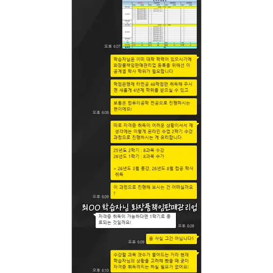 화장품책임판매관리업 등록하는 방법? 안녕하세요, 학점은행제 담당자 헤이쌤입니다 화장품책임판매관리업 등록조건 혹시 알고 계실까요? - 의사/약사 면허증 소지자 - 화장품 제조/품질 관리 경력 2년 - '4년제 학사 학위' (이공계열/화장품 관련 전공) 이중 한개의 조건만 충족이 된다면, 화장품책임판매관리업 등록이 가능한데요! 이번에 문의주신 학습자님은 이미 4년제 디자인 전공으로 학력이 있지만 '이공계열이나 화장품' 관련 학사 학위가 필요한 상황이었습니다 학점은행제 타전공 제도를 활용해 100% 온라인 과정으로 진행하기로 하셨고 25년도 2학기로 들어가 2학기 만에 학위 취득이 가능하신 상황이셨어요! 다만, 화장품책임판매관리업 등록은 정식 학위증이 있어야 가능하기에 내년 8월에 학위를 받고 등록하셔야 했죠 지금이 25년도 2학기이고 다가오는 11월 말부터는 26년도 1학기로 분류되기에 타전공 48학점을 가장 효율적으로 취득하는 건 사실 지금 시작해야 한다는 겁니다! 관심이 생기셨다면 더 늦기 전에 시작해 보는 거 어떨까요? *헤이쌤* TEL : 010-8498-5528 TALK : haesj0710