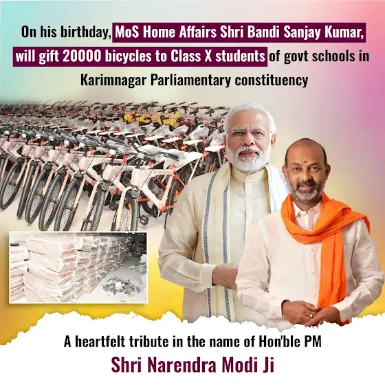 బండి సంజయ్ గారి పుట్టిన రోజు సందర్భంగా మోడీ కానుకగా కరీంనగర్ పార్లమెంట్ పరిధిలోని ప్రభుత్వ మరియు రెసిడెన్షియల్ పాఠశాలలో చదువుకునే 10 వ తరగతి విద్యార్ధులందరికి 20 వేల సైకిళ్ల పంపిణీ చేయనున్న కేంద్ర హోంశాఖ సహాయ మంత్రి వర్యులు బండి సంజయ్ గారు