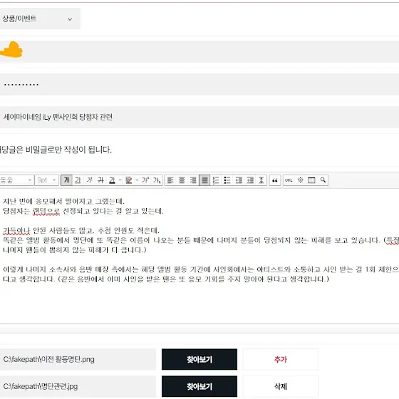 이 이의제기를 통해서 음반활동 팬사인회에서 소속사측은 해당 음반에서 사인을 받은 경우 다시는 응모 못하게 막아놓아야 합니다. (다만 컴백해서 다른 음반 사인회에서는 응모가 가능하게 만들어야 합니다.)