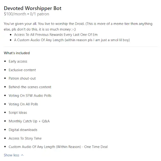 I do hope the bonuses on Patreon would seem like something you find valuable as a return on your money. In the same vein, I value my time and work and hope you can respect my decision to value the tiers at the level I do. Most of them are (imo) reasonably priced and I don't believe are inflated, I just don't want to come off as egotistical or greedy or anything like that.