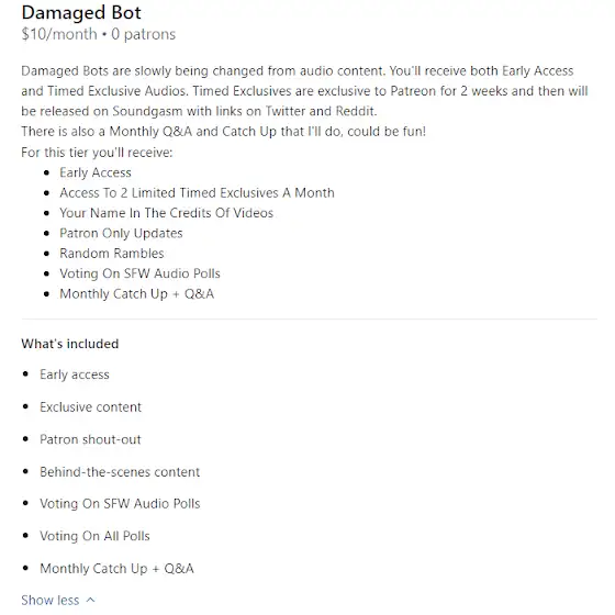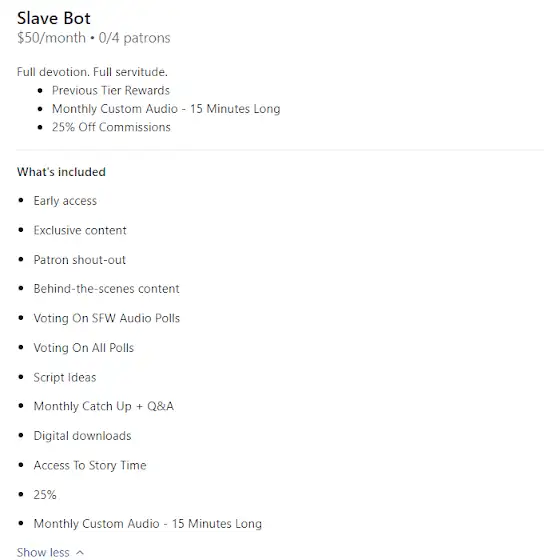 What does it entail? While in this tier, once per month you receive a custom audio between 15-25 minutes long. I won't lie and say I have accidentally made them a longer than that before, I get wayyyy too carried away with them haha.