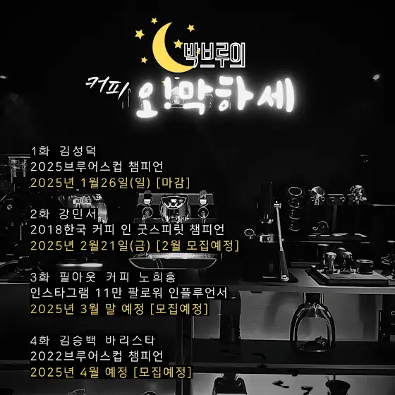 박브루의 커피 오!막하세 출연자 분들을 소개합니다.1화 김성덕2025브루어스컵 챔피언2025년 1월26일(일) [마감]2화 강민서2018한국 커피 인 굿스피릿 챔피언2025년 2월21일(금) [2월 모집예정]3화 필아웃 커피 노희흥인스타그램 11만 팔로워 인플루언서2025년 3월 말 예정 [모집 예정]4화 김승백 바리스타2022브루어스컵 챔피언2025년 4월 예정 [모집예정]4월까지의 출연자 분들이 확정되었습니다.커피를 좋아하는 사람들과 좋은 컨텐츠를제작할 수 있어 영광입니다.4월까지 모집 예정이오니 많은 신청 부탁드립니다.곧 만나요👋🏻👋🏻아무래도 홈이라는 협소한 장소에서 진행하다 보니구독자분 혹은 커피에 관심 있는 3명을 초대하려고 합니다.신청 양식은 성함, 전화번호, 신청 사연을 간단히 남겨주시면추첨을 통해 개별 안내드리겠습니다.*신청조건 : 커피를 좋아하시는 분들이면 누구나 /영상 노출이 가능하신 분신청은 인스타그램 dm으로 부탁드립니다.