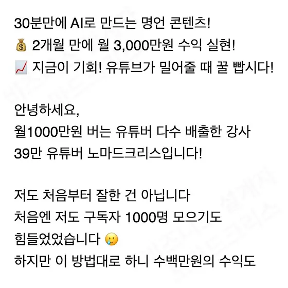 안녕하세요, 월 1,000만 원 유튜버 수십 명을 키워낸 36만 구독자의 유튜버, 노마드크리스입니다! 저도 시작이 쉽진 않았습니다