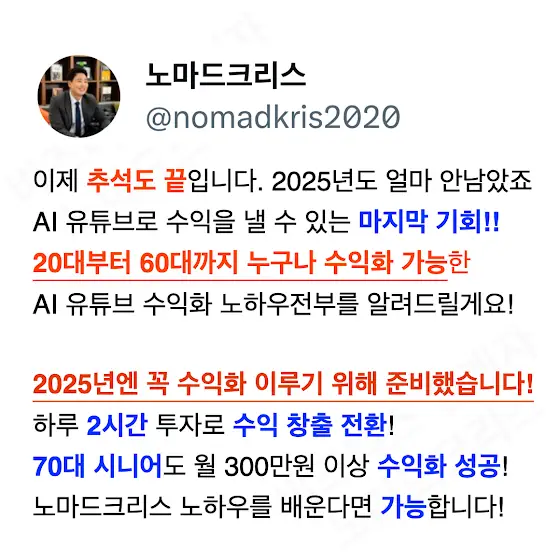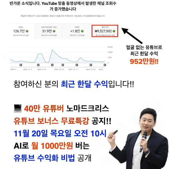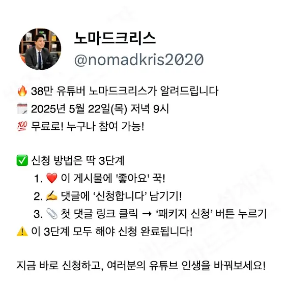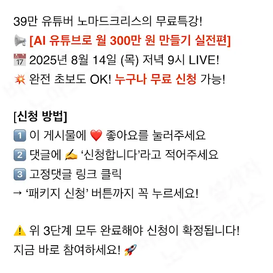 38만 유튜버 노마드크리스의 무료특강! 📢 [AI 유튜브로 월 300만 원 만들기 실전편] 📅 2025년 6월 19일(목) 저녁 9시 LIVE! 💥 완전 초보도 OK! 누구나 무료 신청 가능!