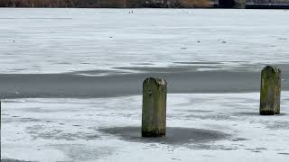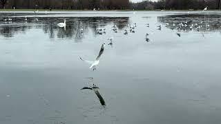 "Gulls stand on ice as a cygnet flies low over the frozen Round Pond, lands and gets stuck🦢❄️(Pt.1)"