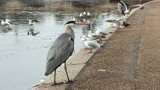 "Mute swans and cygnets rest or preen on the Round Pond’s open water as gulls stand on the ice 🦢🐦❄️"