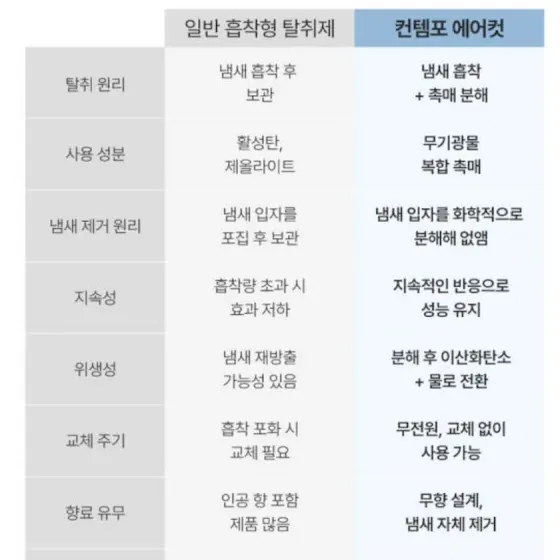 ✔️국제특허 CH-CUT 필터 기술 방향제처럼 향으로 덮는 게 아니라 냄새 분자를 ’컷‘해서✂️ 이산화탄소 + 물로 분해하는 신개념 탈취기술✨ ✔ 국가공인 테스트 완료 (최대 99.8% 탈취력) ✔ 유해물질 불검출! 반려동물·아이 있는 집도 안심 ✔️💸 유지비 0원, 가성비 끝판왕 보통 탈취제 10년? 교체비 약 60만원💸 👉 에어컷은 단 한 번 구매로 10년이상 사용 가능!