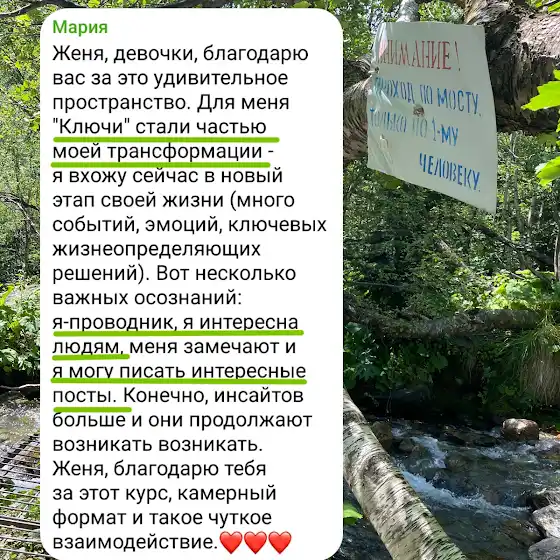Меня особенно тронули слова о том, что «Ключи» стали частью личной трансформации. Участница осознала себя проводником, поняла, что интересна людям, и открыла в себе талант к написанию постов.