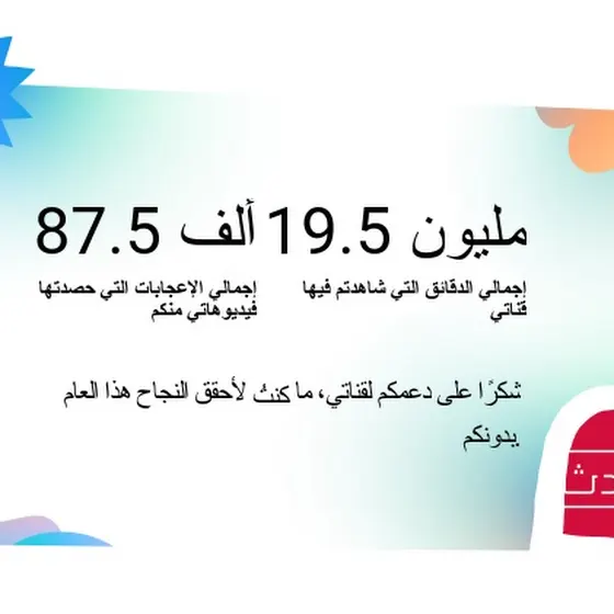 مشتركنا الغالي 🌷شكرًا من القلب للمساهمات الرائعة في انجاح مسيرة القناة .. نبذة عن ارقام عام 2022 - مليون 9.2إجمالي المشاهدات- مليون 19.5إجمالي وقت المشاهدة بالدقائق- ألف 87.5إجمالي عدد المعجبين #MyYearOnYouTube