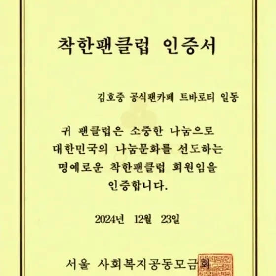 김호중 가수님의 선한 영향력을 지속하고자 공식 팬까페 트바로티는 사랑의열매 (사회복지 공동모금회)를 통해 1주일간(2024.12.16~12.22) 아리스들의 정성을 모았습니다.