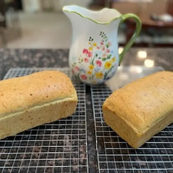 Check out Sandy's beautiful loaf of sourdough bread! She used the 2 loaf pan method in the Easiest Same-Day Sourdough in a Loaf Pan recipe (https://youtu.be/SJ0w7_X71lo) and likes that the slices can fit into the toaster better. This is a really pretty loaf Sandy! Y'all be sure to try this for your next batch of sourdough!
