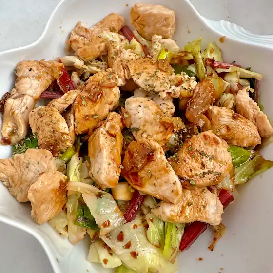 Un plato único apetecible. Rehogo ajo, puerro y acelgas (sartén con tapa) posteriormente el pavo. Una vez cocinado añado lexhuga, salsa de soja, semillas y especias🤗