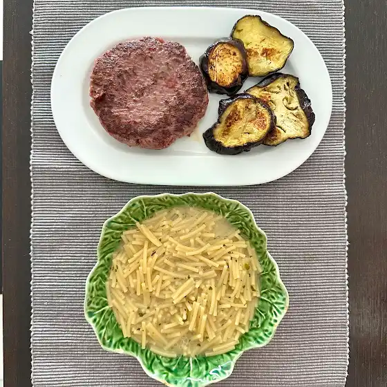 Sopa de fideos con berenjena y hamburguesa.
