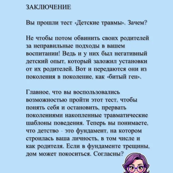 💁🏻♀️ Мой авторский тест «Детские травмы» - ваш шанс разобраться в себе, выявить скрытые установки и избежать повторения ошибок своих родителей.