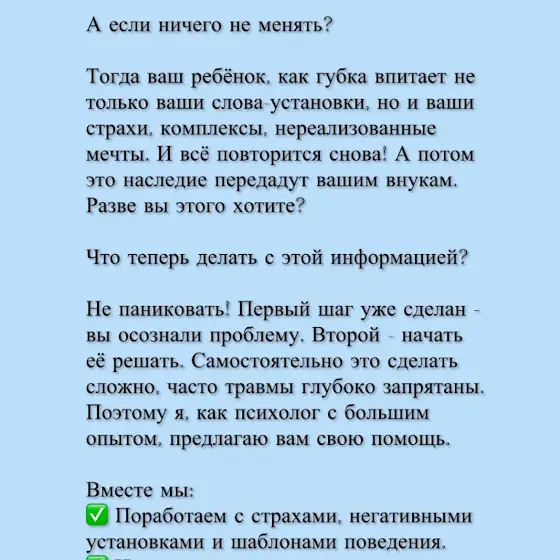 👉Мы все прекрасно понимаем, что и у нас самих есть набор из детских травм, обид и установок. Поэтому на это я тоже делаю серьёзный акцент, потому что они неосознанно влияют на наши мысли и поведение.