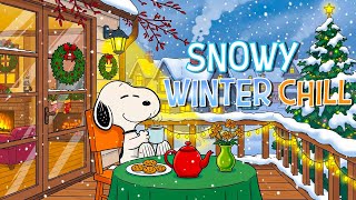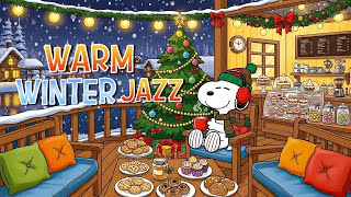Snoopy’s Winter Sunset Café 🌅Cozy Christmas & Warm Fireplace Jazz❄️ Relaxing Holiday for Study, Work