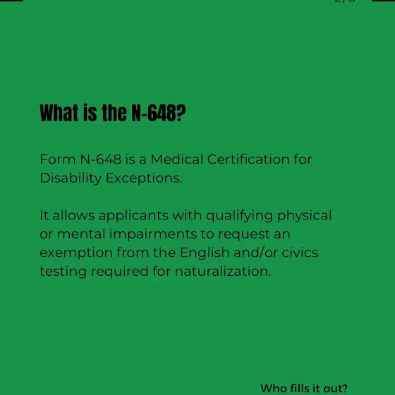 La forma N-648 es una exención médica que te exime de hacer el examen de ciudadanía debido a una discapacidad médica o psicológica.