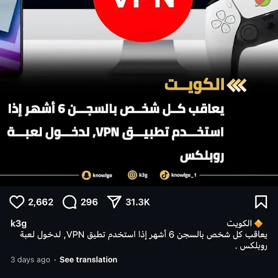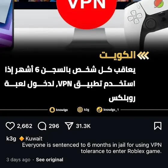 ENGLISH: Hi people who lives in Kuwait. This is real. Unfortunately, it’s now a crime. If everyone uses VPN to access Roblox after the Kuwait Roblox ban if lives in Kuwait, Kuwaiti people will be sentence to prison/jail for 6 months or be punished with 6 months in prison. Everyone is sentenced to 6 months in jail for using VPN tolerance to enter Roblox game. I will be punished with 6 months in prison if I use VPN to access Roblox the Kuwait Roblox ban. I will be inactive if I’m punished with 6 months in prison if I use VPN to access Roblox the Kuwait Roblox ban. I will be active if I will be back in 6 months in prison. My dad told me to delete Roblox and UFO VPN on my MacBook Pro. I will be careful. Go to my 3rd post and 4th post for the English translation. That’s all.