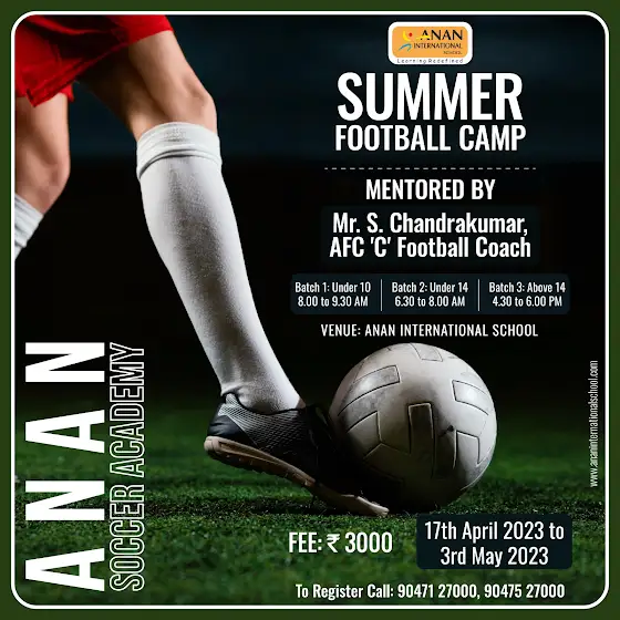 Score big this summer with Anan International School's Football Camp! Join us from 17th April to 3rd May and experience the thrill of football like never before, under the expert guidance of Coach MR.S. Chandrakumar AFC 'C'.