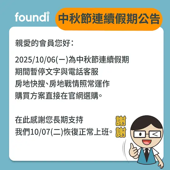 2025/10/4(六)~10/6(一)為中秋節假期,期間暫停文字與電話客服,房地快搜、房地戰情照常運作;購買方案請直接在官網選購。