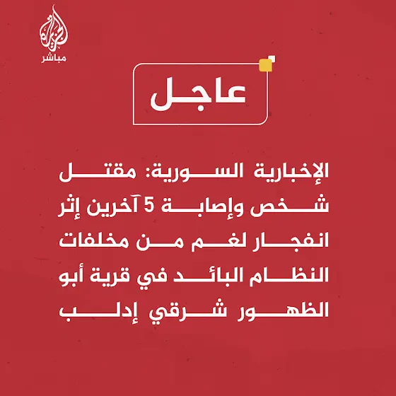 عاجل | الإخبارية السورية: مقـ ـتـل شخص وإصابة 5 آخرين إثر انفجار لغم من مخلفات النظام البائد في قرية أبو الظهور شرقي #إدلب #الجزيرة_مباشر #سوريا
