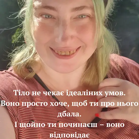 Тіло не оцінює тебе.Воно не чекає п’ятірку чи медаль.Воно потроху реагує.– Випила коктейль – стало легше.– Пройшлася замість посидіти – з’явилась енергія.– Попила води – минув головний біль.Я піклуюсь про себе, як вмію.І цього вже досить