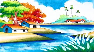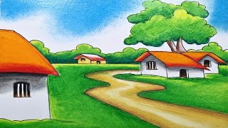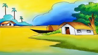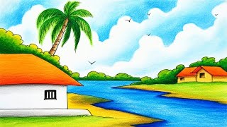 How to Draw Easy Village Scenery/Beautiful Landscape Drawing/Prakritik Drishya Drawing for Beginners
