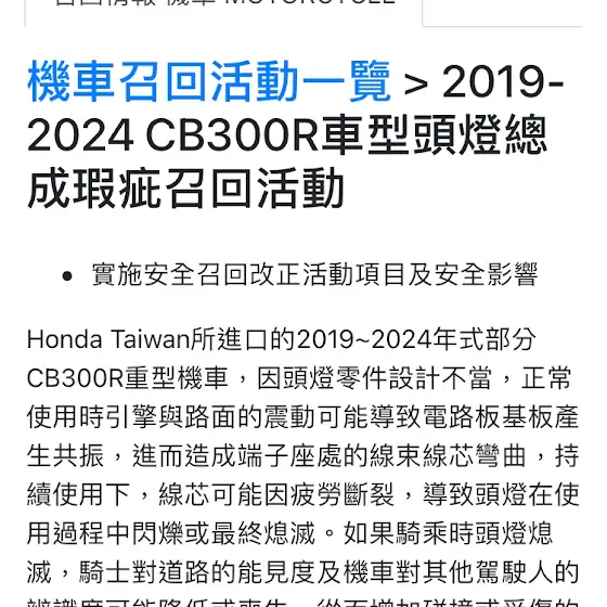 收到了台本的召回通知CB300R已經陪了我快三年的時間如果說大學是最寶貴的青春那CB300R絕對是我最無價的回憶沒想到這麼多年還會收到召回通知記得當初買車正處於疫情時公司車與水貨車是很多人討論的議題做了許多功課後那時的我選擇了買公司車時至今日才了解意義突然想到拍攝了這麼多台車和很多車主聊天好像還沒和CB300R的車主聊過有沒有車主要一起去召回?騎騎車、聊聊你們跟車子的故事😃(不是300r也行)