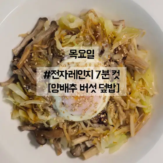 ✅목요일 <양배추 버섯 덮밥> ✔️재료(1인분) 양배추 1줌, 버섯 한두 줌(느타리·팽이버섯 등 등 집에 있는 거), 계란 1개, 밥 반 공기, 간장 1스푼(드셔보시고 싱거우면 1스푼 추가), 들기름 1스푼, 깨 약간 ✔️만드는 법 1. 양배추는 채 썰고 버섯은 먹기 좋게 잘라주세요 2. 전자레인지 용기에 양배추+버섯 넣고 7분 돌려줍니다 3. 수란을 만들어요(물 한 컵에 +계란 깨서 전자레인지에 1분) 4. 그릇에 밥 반 공기 담고 양배추, 버섯, 수란 순서로 올려주세요 5. 간장, 들기름, 깨 톡톡 뿌리면 완성!