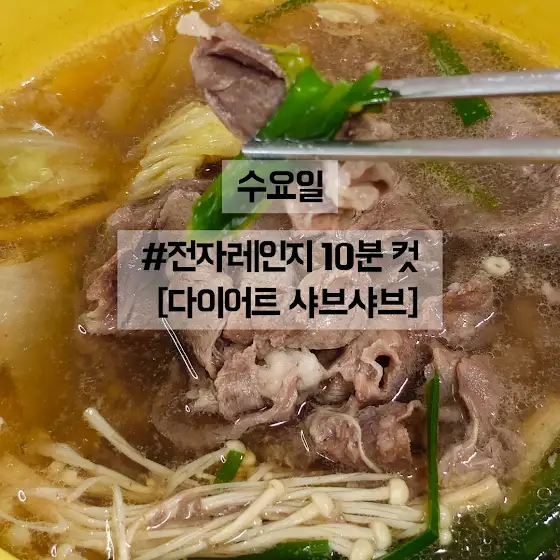 ✅수요일 <다이어트 샤브샤브> ✔️재료 코인 육수 2알(잘게 자름), 물 1컵(약 300ml), 집에 있는 야채·버섯 한 줌, 샤브샤브용 소고기 100g, 국간장 1스푼 ✔️만드는 법 전자레인지 용기에 코인 육수 + 물 넣고 2분 돌려 육수 만들기→ 그 위에 채소·버섯 올리고 고기 얹은 뒤 국간장 넣기→ 뚜껑 덮고 전자레인지 8분 돌리면 끝!