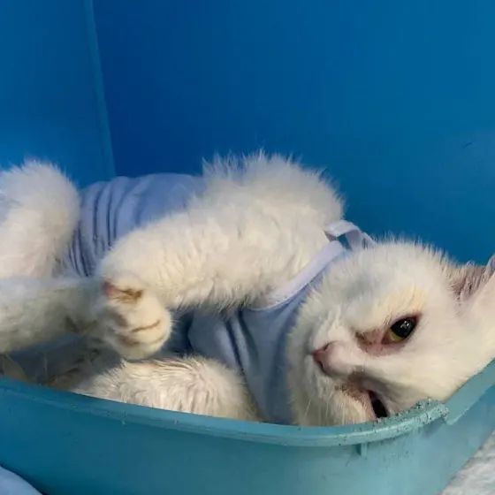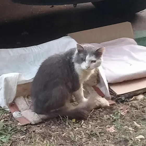 С начала лета их домом стала местная мусорка. Кошки выживали как могли. Волонтерам удалось отловить и пристроить всё семейство. Оставалась только эта белая малышка — самая осторожная, самая недоверчивая. Близились морозы, и мы понимали: нежной, домашней когда-то кошке зиму на улице не пережить.