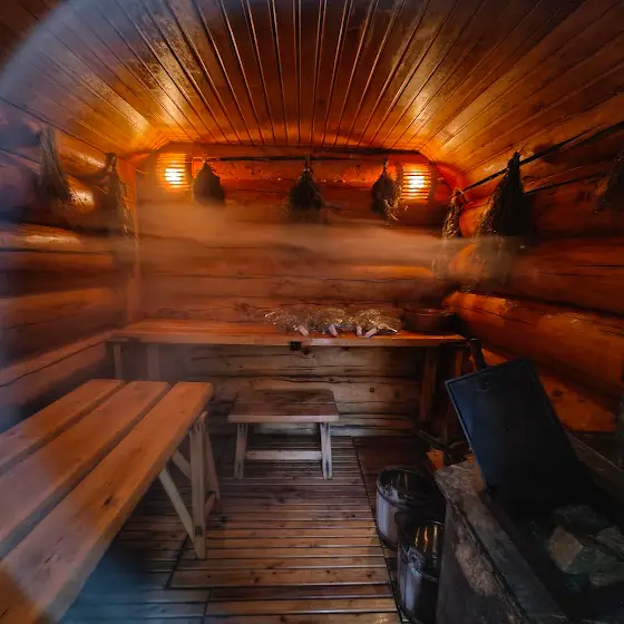 Вечерняя баня — для глубокого релакса. Она смывает не просто пот, а всю накопленную за день суету. Жар растворяет в себе усталость, а тишина и шепот реки за окном успокаивают ум.