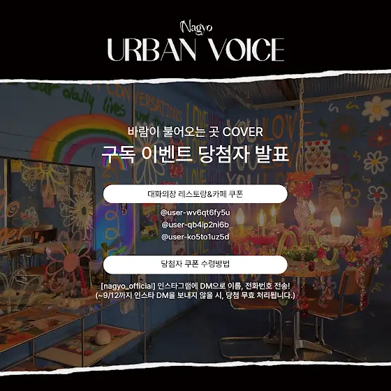 자세한 문의사항 역시 인스타 디엠을 통해 주시면 더욱 빠르게 답변해 드리도록 하겠습니다. 앞으로도 나교 어반 보이스 참여 이벤트는 계속됩니다. 많은 관심과 사랑 부탁드립니다.❤