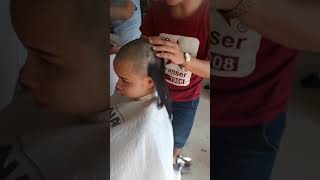 Shave up her nape she her undercut shaved clean to skin by the clippers as the barberette holds head