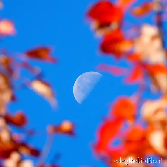 Set ablaze by Autumn's magic Wand, the leaves burn with a fiery red.🍁 Wrapped in their warm glow, a shining timeless witness, hundreds of thousands of kilometers away, in its own changing phase. 🌓 Two ancient cycles etched in a rich blue tapestry, one on Earth and one in the Heavens.🌎🌕 One momentary thread connecting our home to the cosmos.⭐️