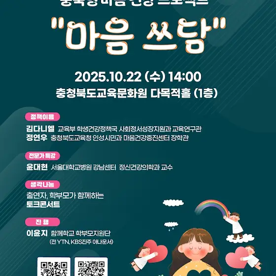 우리 아이 마음 건강, 지금, 함께“마음 쓰담”🌱[2025 찾아가는 교육정책 서비스]다가오는 10월 22일 충청북도교육문화원에서 <마음 쓰담>을 주제로 학부모 대상 행사가 열립니다! 🗓️ 일시: 2025년 10월 22일(수) 오후 2시📍 장소: 충청북도교육문화원 다목적홀(1층)🎤 정책이음김다니엘 (교육부 학생건강정책과)정연우 (충북교육청 마음건강증진센터)🎓 전문가 특강윤대현 (서울대병원 강남센터 정신건강의학과 교수)💬 생각 나눔출연자 & 학부모가 함께하는 토크콘서트🎙 진행이윤지 (전 YTN, KBS전주 아나운서 / 함께학교 학부모지원단)우리 아이 마음에도 공교육의 따뜻한 손길이 닿을 수 있도록,교육부, 충북교육청, EBS가 함께합니다🌸현장 참석은 물론, EBS i 유튜브 채널을 통해 실시간으로도 참여하실 수 있으니 많은 관심 부탁드립니다💌