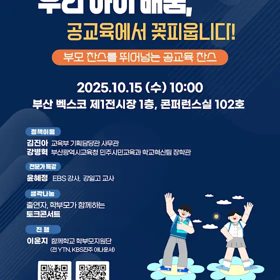 우리 아이 배움, 부모 찬스를 넘어 공교육으로🌸[2025 찾아가는 교육정책 서비스]다가오는 10월 15일 부산 벡스코에서<부모 찬스를 뛰어넘는 공교육 찬스>를 주제로 학부모 대상 행사가 열립니다!✔️ 정책이음: 김진아 교육부 기획담당관 사무관, 강병혁 부산광역시교육청 민주시민교육과 학교혁신팀 장학관✔️ 전문가특강: 윤혜정 EBS 강사, 강일고 교사✔️ 생각나눔: 출연자, 학부모가 함께하는 토크콘서트✔️ 진행: 이윤지 함께학교 학부모지원단 (전 YTN, KBS 전주 아나운서)부모 찬스가 아닌, 공교육이 아이의 성장을 책임집니다.교육부와 부산교육청, EBS가 함께하겠습니다!🌱현장 참석은 물론, EBS i 유튜브 채널을 통해 실시간으로도 참여하실 수 있으니 많은 관심 부탁드립니다💌📌 일시 : 2025년 10월 15일(수) 오전 10:00📌 장소 : 부산 벡스코 제1전시장 1층, 컨퍼런스실 102호#찾아가는교육정책서비스 #EBSi #공교육찬스 #부모교육#부산광역시교육청 #교육부 #교육정보 #입시정보