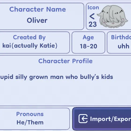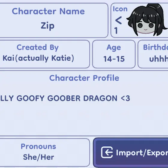 Info is done, and when you read “Kai(actually Katie)” it just means the actual character is by here but the Gacha version is by me, and the “KallMeKai” is what I’ll change my user to when I feel like it….